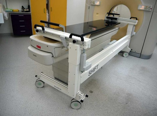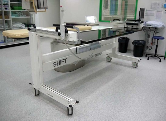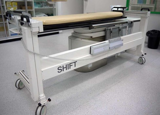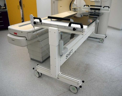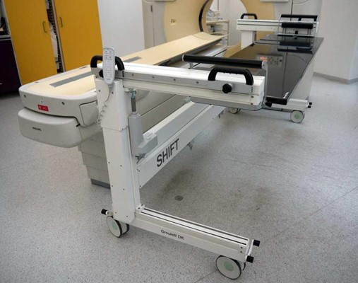 CT Shift er beregnet til at blive brugt som et røntgenbord til at flytte patienten til angiobordet og forskyde patienten over på angiobordet fra den ene side og flytte patienten til CTscanneren og forskyde patienten over på scannerbordet fra den anden side for at holde patientens hoved i den rigtige retning.